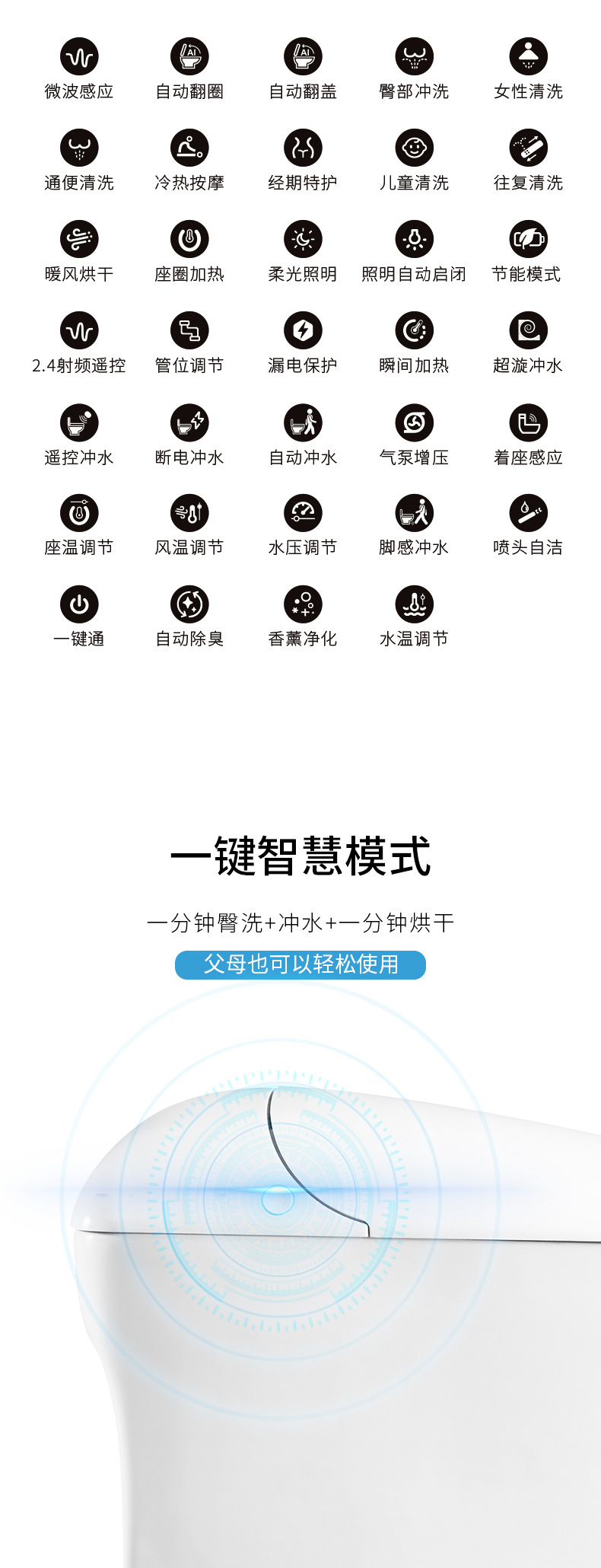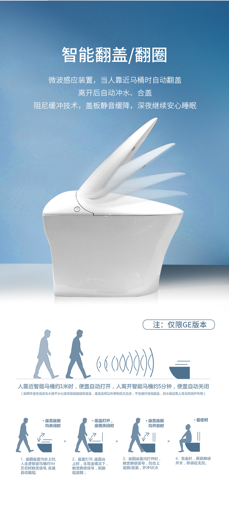 產品功能:1、微波感應、自動翻蓋/翻圈、
